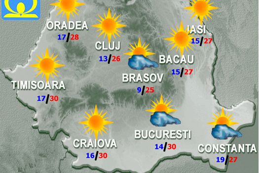 Temperaturile maxime se vor încadra între 24 de grade în depresiuni şi 32 de grade în sudul Olteniei, iar cele minime vor fi cuprinse între 9 şi 19 grade, mai scăzute în depresiuni până la 2 grade. Dimineaţa şi noaptea, izolat, va fi ceaţă.