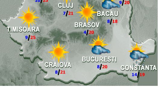 Temperaturile maxime vor fi cuprinse între 15 grade în depresiuni şi 26 de grade în vestul ţării, iar cele minime între -2 grade în estul Transilvaniei şi 15 grade pe litoral. Dimineaţa şi noaptea, izolat în zonele joase se va semnala ceaţă.