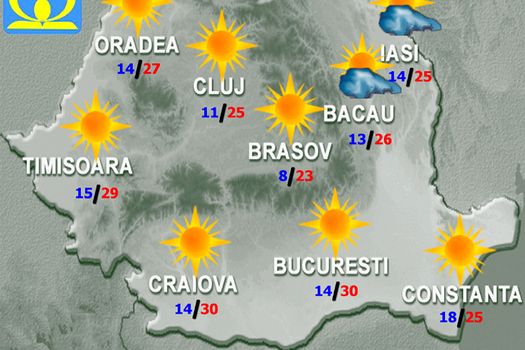 Temperaturile maxime se vor încadra între 22 şi 32 de grade, iar cele minime între 7 şi 17 grade, mai scăzute în depresiunile intramontane, până la 3 grade.