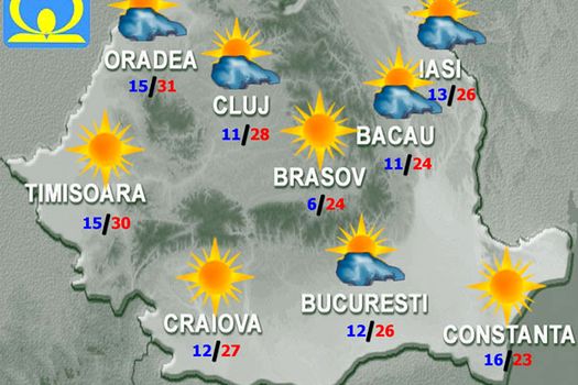 Vremea se va menţine predominant frumoasă. Cerul va fi variabil, cu înnorări noptea în vestul ţării, unde cu totul izolat vor fi condiţii să plouă slab. Vântul va sufla slab şi moderat. Temperaturile maxime vor fi cuprinse între 22 de grade în Delta Dunării şi pe litoral şi 31 de grade în Câmpia de Vest, iar cele minime se vor încadra între 8 şi 18 grade, mai scăzute în estul Transilvaniei spre 2 grade.