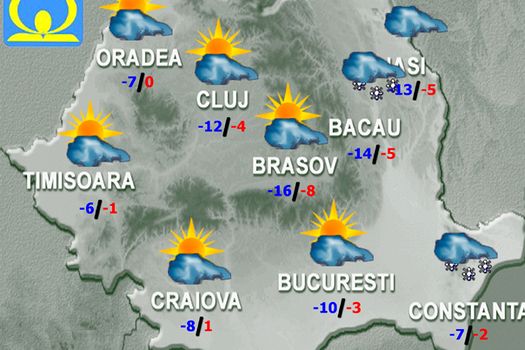 Miercuri în ţară vremea se va menţine rece în majoritatea regiunilor, geroasă dimineaţa şi noaptea îndeosebi în centru şi est. Cerul va fi variabil, cu unele înnorări noaptea în regiunile vestice şi nord-vestice, unde vor fi condiţii de ninsori slabe. Vântul va sufla slab şi moderat, cu unele intensificări pe crestele montane. Temperaturile maxime se vor încadra între -11 grade în estul Transilvaniei şi 2 grade în Oltenia, iar cele minime vor fi de la -23 de grade în depresiunile Carpaţilor Orientali până la -6 -4 grade în regiunile vestice. Local în zonele joase se va semnala ceaţă cu depunere de chiciură.