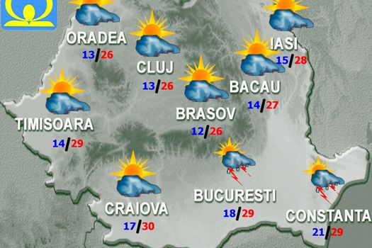 Vremea va fi uşor instabilă. Temporar cerul va fi noros şi trecător vor fi ploi slabe şi, posibil, descărcări electrice. Vântul va sufla slab şi moderat. Temperatura maximă va fi de 28…29 de grade, iar cea minimă de 17…19 grade.
