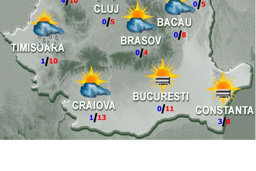 La munte, vor fi şi ninsori şi lapoviţă, favorizând, dar numai izolat, formarea de polei. Vântul va sufla slab şi moderat, cu intensificări la munte, mai ales pe creste, dar temporar şi la cote mai reduse şi în nord-vest, centru şi sud-estul extrem al teritoriului. Temperaturile maxime vor avea valori de la 2…3 grade în estul Transilvaniei, până la 13…15 grade în sudul Banatului, Oltenia şi în nord-vestul Munteniei. Temperaturile minime se vor încadra între -3 şi 5 grade, cu cele mai ridicate valori în Dealurile de Vest. Dimineaţa şi noaptea, îndeosebi în sud-estul şi sudul ţării, local va fi ceaţă.