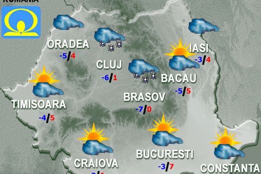 Temperatura aerului va fi în scădere uşoară, astfel că maxima va fi între 6 şi 7 grade, iar minima între -4 şi -3 grade.