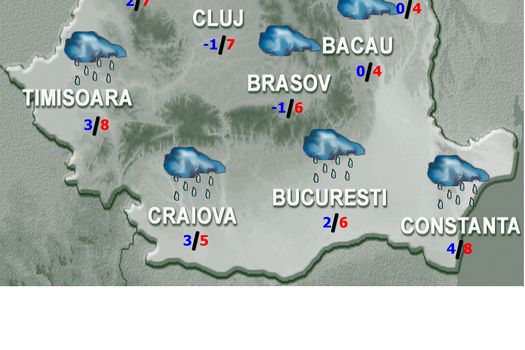 Valorile termice vor scădea uşor în majoritatea regiunilor. Cerul va fi mai mult noros şi local vor fi precipitaţii slabe, mai ales în regiunile sudice, predominant sub formă de ploaie în prima parte a zilei, apoi şi sub formă de lapoviţă şi ninsoare. Vor fi condiţii de polei. La munte vor predomina ninsorile. Vântul va sufla slab şi moderat, cu intensificări mai ales noaptea în sud, în sud-est şi în zona montană. Temperaturile maxime se vor încadra între 0 şi 9 grade, iar cele minime între -7 şi 3 grade, cu cele mai scăzute valori în depresiunile Carpaţilor Orientali.