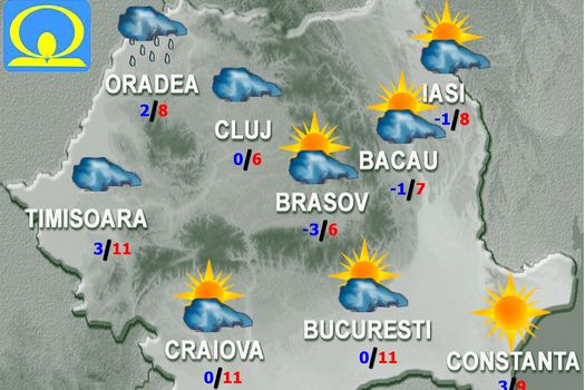 În Munţii Apuseni şi în zona Carpaţilor Orientali vor fi precipitaţii mixte, iar în Maramureş şi Crişana şi pe arii restrânse în Banat şi nordul Transilvaniei va ploua slab. Noaptea ploi izolate vor fi şi în nordul Moldovei unde se va depune polei. Vântul va sufla slab şi moderat, cu intensificări pe crestele montane. În cursul nopţii în regiunile sudice vor fi condiţii de ceaţă. Temperaturile maxime vor fi cuprinse între 3 şi 13 grade, iar cele minime între -5 şi 5 grade, mai scăzute în depresiuni, până la -8 grade.