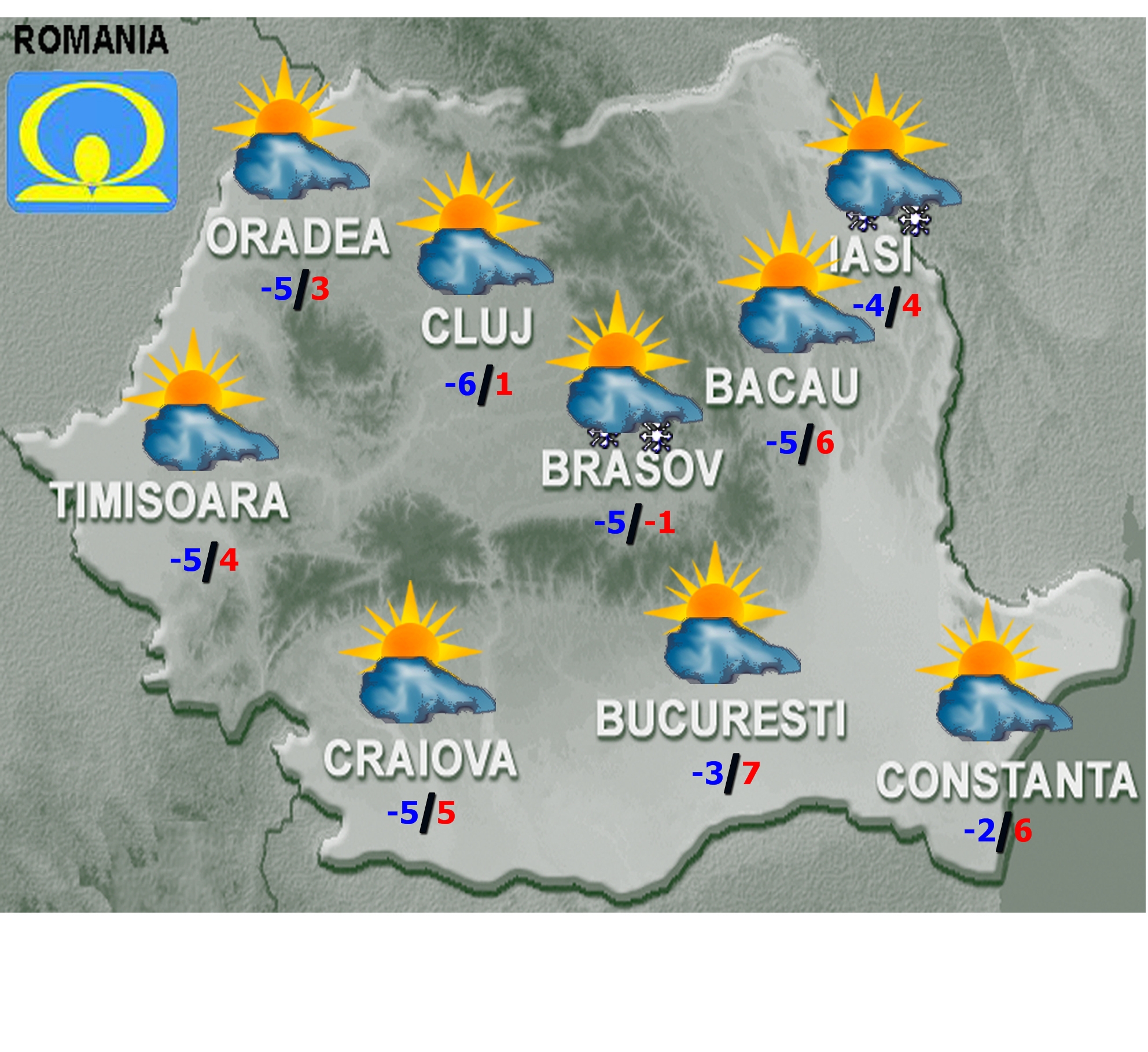 Valorile termice, în special cele nocturne, vor continua să se situeze sub cele climatologic specifice acestei date din an la nivelul intregii tări. Cerul va fi variabil, cu innorări in regiunile nordice, nord-estice si in zona Carpatilor Orientali, unde trecător si pe arii restranse va ninge slab. Vantul va sufla slab şi moderat, cu intensificări trecătoare mai ales în zona montană înaltă, unde va viscoli ninsoarea si spulbera zăpada. Temperaturile maxime vor fi cuprinse între -3 si 6 grade, iar cele minime între -13 si -1 grad, usor mai coborâte în zonele depresionare. Izolat, în zonele joase de relief, mai ales dimineaţa şi noaptea se va semnala ceată, asociată cu depunere de chiciură.