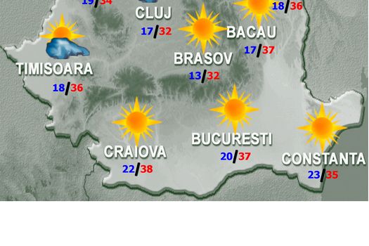 Temperaturile maxime se vor situa, în general, între 30 şi 39 de grade, iar cele minime vor fi cuprinse între 13 şi 23 de grade, mai scăzute în estul Transilvaniei, dar şi mai ridicate pe litoral. Cerul va fi mai mult senin, cu unele înnorări în regiunile vestice şi nord-vestice, unde izolat, spre sfârşitul intervalului, vor fi averse şi descărcări electrice. Vântul va sufla slab şi moderat cu unele intensificări la munte, iar în cursul zilei şi în regiunile intracarpatice şi izolat în restul teritoriului.