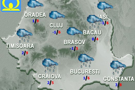 Vineri, vremea se va menţine în general închisă. Local şi temporar se va produce ceaţă şi vor fi precipitaţii slabe, fulguieli sau burniţă, mai ales în sudul şi în estul ţării. Pe arii restrânse la munte va ninge slab. Vântul va fi slab şi moderat, cu unele intensificări în zona montană înaltă, iar în cursul zilei şi în regiunile sud-estice. Temperaturile maxime vor fi cuprinse între -1 şi 8 grade, iar cele minime între -6 şi 3 grade, mai scăzute în depresiuni, până în jur de -8 grade.