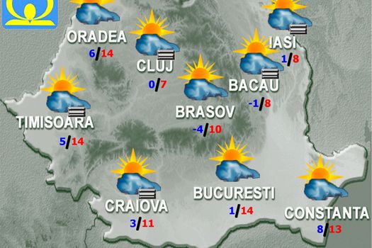 Mai ales dimineaţa şi noaptea va fi ceaţă, local în zonele joase din sud, est şi centru şi izolat în rest. Vor fi condiţii de burniţă sau ploaie slabă. Vântul va sufla slab şi moderat, cu intensificări trecătoare în Delta Dunării şi în Câmpia de Vest. Temperaturile maxime vor fi cuprinse de la 4 grade în nord-est până la 16 grade în vest. Temperaturile minime se vor situa de la -7 grade în estul Transilvaniei până la 10 grade în Dealurile de Vest.