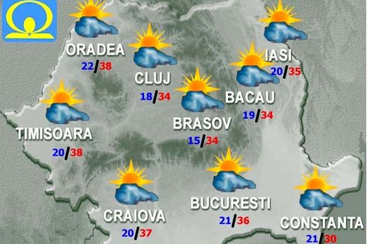 În ţară, vineri, vremea va fi în continuare caniculară, iar disconfortul termic va fi accentuat. Cerul va fi variabil, cu înnorări temporare după-amiaza şi la începutul nopţii, când vor fi averse, descărcări electrice şi intensificări de scurtă durată ale vântului pe arii restrânse în regiunile sud-vestice şi la munte. Vor fi condiţii de grindină. Temperaturile maxime vor fi cuprinse, în general, între 30 şi 37 de grade, iar cele minime între 15 şi 25 de grade, mai scăzute în depresiuni.