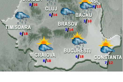 În ţară, vremea va fi în continuare deosebit de caldă, exceptând regiunile nordice şi vestice unde valorile termice vor fi în scădere uşoară. În vest, nord şi centru cerul va fi noros şi vor fi ploi pe arii extinse, izolat mai însemnate cantitativ. Trecător la munte precipitaţiile vor fi şi sub formă de lapoviţă sau ninsoare, iar noaptea va fulgui şi în nordul Moldovei. În restul ţării cerul va fi temporar noros, iar ploile se vor semnala local, mai ales în cursul zilei. Vântul va sufla slab şi moderat, cu unele intensificări în regiunile sudice şi în zona de munte. Temperaturile maxime se vor încadra între 2 grade în nordul extrem al Moldovei şi 20 de grade în Lunca Dunării, iar cele minime vor fi cuprinse între -1 şi 9 grade..