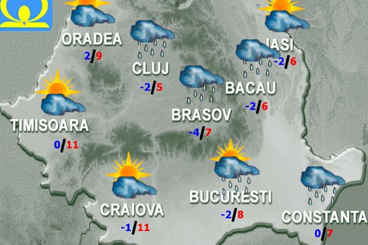 Vremea se va menţine caldă pentru această perioadă din an. Cerul va fi mai mult noros în nordul şi în centrul ţării, unde vor fi precipitaţii sub formă de ploaie şi lapoviţă, precum şi în zona de munte, unde vor predomina ninsorile. În celelalte zone cerul va fi variabil, cu înnorări temporare şi ploi locale, ziua în sud şi est, iar noaptea în special în regiunile vestice. Vântul va continua să sufle tare pe crestele montane şi va avea intensificări locale, temporare şi în vestul, sudul şi centrul teritoriului. Temperaturile maxime vor fi cuprinse în general între 2 şi 12 grade, iar cele minime între -5 şi 5 grade, uşor mai scăzute în depresiuni.