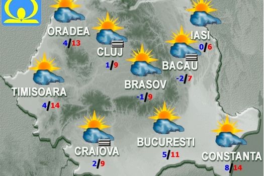 Temperaturile maxime vor fi cuprinse între 0 şi 14 grade, iar cele minime între -8 şi 2 grade, mai ridicate pe litoral. În zonele joase, pe arii restrânse vor fi condiţii de ceaţă.
