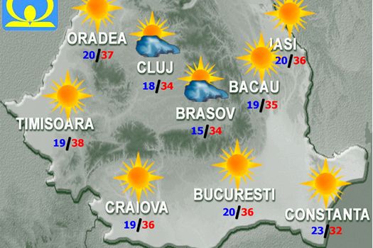 Vremea se va menţine caniculară după-amiaza în cea mai mare parte a ţării, iar disconfortul termic va fi accentuat. Cerul va fi variabil şi în a doua parte a zilei şi noaptea vor fi averse, descărcări electrice şi unele intensificări ale vântului, local în zona de munte şi în sud-estul teritoriului şi cu totul izolat în rest. Vor fi condiţii de grindină. Temperaturile maxime se vor încadra de la 29…30 de grade pe litoral până la 38…39 de grade în Banat, Crişana şi vestul Olteniei. Valorile minime se vor încadra între 16 şi 26 de grade, mai scăzute în depresiuni.