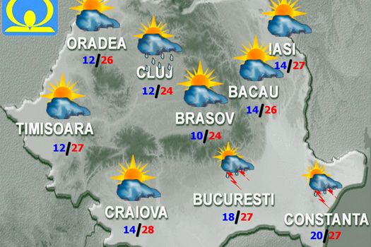 Miercuri, vremea va fi în general frumoasă. Cerul va fi variabil spre parţial noros şi izolat vor fi posibile ploi slabe, de scurtă durată. Vântul va sufla slab şi moderat, cu unele intensificări în zona montană. Temperaturile maxime se vor încadra între 22 şi 29 de grade, iar cele minime între 9 şi 17 grade, mai scăzute în depresiuni, până la 6 grade în cele din estul Transilvaniei, dar şi mai ridicate pe litoral.