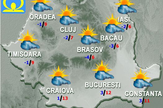 Vântul va sufla slab până la moderat. Temperatura maximă se va situa în jurul valorii de 12 grade, iar cea minimă va fi de 1…3 grade. Vor fi condiţii de brumă în zona preorăşenească.