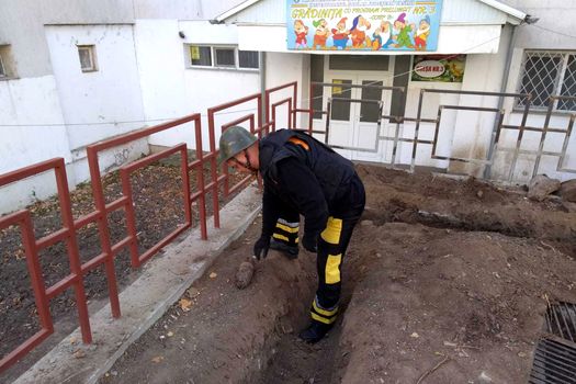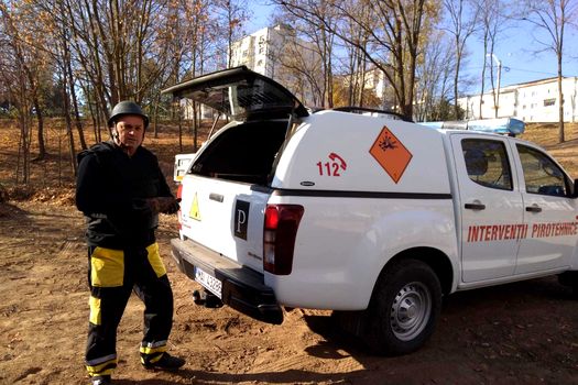 O echipă pirotehnică a intervenit pentru ridicarea proiectilului găsit în zona Parcului Bloc 199, situată lângă o grădiniţă, unde se fac modernizări.