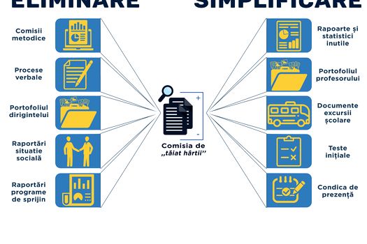 Grupul de lucru, cunoscut sub denumirea de ,,Comisia de tăiat hârtii”, prezintă, printr-un comunicat de presă, un prim raport ce are în vedere eficientizarea procesului de predare – învăţare – evaluare. În urma propunerilor primite pe platforma debirocratizare.edu.ro<https://www.debirocratizare.edu.ro/> şi a dezbaterilor din perioada noiembrie-decembrie 2019, comisia a decis eliminarea şi simplificarea unor documente în vederea eficientizării procesului de predare – învăţare – evaluare.