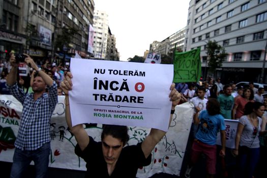 17.00 UPDATE Sute de persoane protestează în Piaţa Universităţii faţă de proiectul de exploatare minieră de la Roşia Montană, promovat de Guvern într-un proiect de lege aprobat în această săptămână.