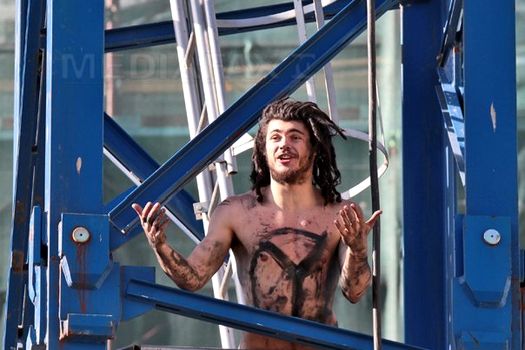 Tânărul, dezbrăcat complet, a pledat de la 50 de metri înălţime pentru stoparea poluării şi a traficului sufocant din Capitală.