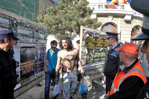 Tânărul, care le-a spus autorităţilor că este student la Arhitectură, riscă o contravenţie pentru protestul său inedit.