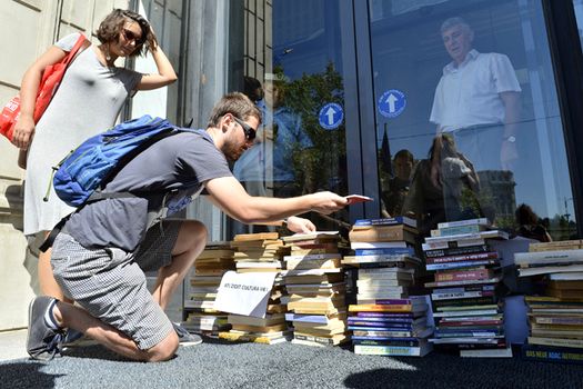 Prima pagină » Cultură-Media » Protest pentru cultură, cu teancuri de cărţi la intrarea în Ministerul Finanţelor