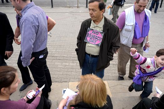 Organizatorii au împărţit trecătorilor caricaturi cu preşedintele Traian Băsescu şi fluturaşi cu textul „No Băsescu Day. O zi fără Băsescu…pentru cealaltă jumătate de Românie. 2 aprilie – ziua în care ne întâlnim îmbrăcaţi în violet non-Băsescu”.