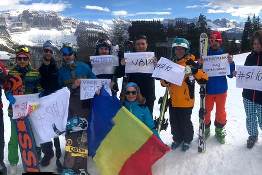 Protestul pentru autostrăzi #şîeu a fost susţinut şi de români aflaţi în vacanţă în Italia. Românii s-au oprit 15 minute din schiat, având steaguri naţionale şi pancarte cu mesajul #şîeu sau #şînoi.