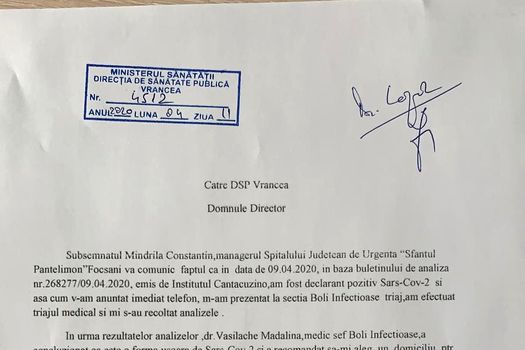 „M-am prezentat la Secţia Boli Infecţioase unde am fost consultat şi mi s-au recoltat analize, iar în urma rezultatelor, dr. Vasilache Mădălina, şefa secţiei, a concluzionat că este o formă uşoară de Covid -19 . După prevederile Protocolului de tratament al infecţiei cu virusul SARS Cov 2 din 26.03.2020, formele uşoare se tratează la domiciliu în autoizolare. Fac precizarea că HG 201/2020 precizează, la articolul 1, alineatul 5, punctul c), că persoanele confirmate COVID-19 asimptomatice sau cu forme uşoare, nu necesită internarea în unităţi sanitare pentru tratare. De asemenea, ordinul ministrului sănătăţii 487 din 23.03.2020 prevede: cazurile uşoare se pot externa mai rapid sau chiar îngriji la domiciliu cu respectarea unor recomandări. Astfel, m-am autoizolat imediat la domiciliul ales, am informat prin adresă scrisă DSP Vrancea unde mă aflu şi unde voi sta în autoizolare. Am păstrat legătura permanent cu medicul curant căruia îi raportam zilnic funcţiile vitale (temperatura, concentraţia de oxigen din sânge şi tensiunea), am respectat tratamentul prescris, nu am intrat în contact cu nimeni şi am încercat să mă odihnesc fiind foarte obosit şi speriat. Am anunţat directorul medical şi medicul epidemiolog al spitalului de situaţia mea. Pentru că starea de sănătate îmi permitea, am vorbit cu directorul medical şi am stabilit de comun acord să continui activitatea desfăşurata din izolare. Motiv pentru care, am luat şi calculatorul de serviciu, pentru a lucra împreună online (am dovezi în acest sens, deoarece am lăsat inclusiv notificare scrisă către directorul medical)”, a spus directorul Spitalului Judeţean de Urgenţă Sf. Pantelimon, Constantin Mândrilă.