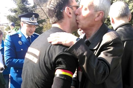 La intrarea în Parcul Herăstrău din Capitală, jandarmul din Galaţi a fost întâmpinat de Ambasadorul Belgiei la Bucureşti, Thomas Baekelandt şi soţia sa. Aceştia l-au imbrăţişat, i-au înmânat un buchet de flori şi i-au mulţumit pentru gestul său.