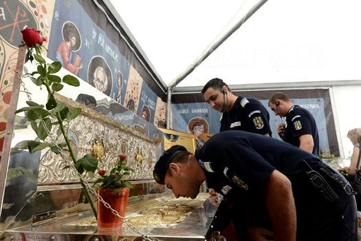 Reprezentanţii clerului român şi ierarhii delegaţi, miniştri şi alţi oficiali şi apoi enoriaşii au trecut pe la raclă să se închine. Printre ei, au fost şi jandarmi care supravegheau desfăşurarea manifestării.