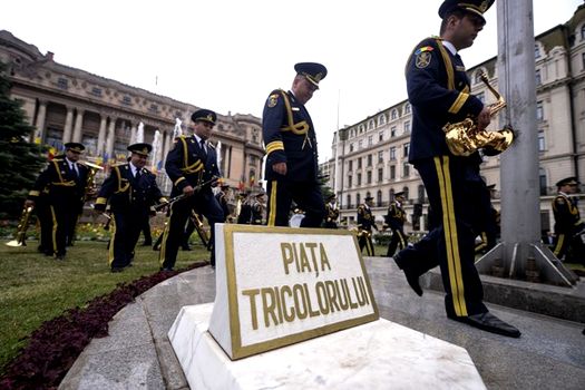 Mai multe persoane s-au adunat, vineri seara, în jurul orei 21.30, în Piaţa Tricolorului din Bucureşti, pentru a participa la ceremonia organizată cu ocazia Zilei Drapelului Naţional.