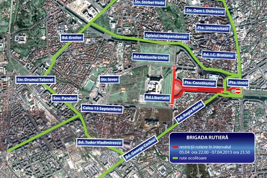 Astfel, de vineri, ora 22:00, şi până duminică, ora 23:50, traficul rutier va fi restricţionat pe Bulevardul Libertăţii, între Calea 13 Septembrie şi Bulevardul Naţiunile Unite, şi pe Bulevardul Unirii, între Bulevardul I. C. Brătianu şi Piaţa Constituţiei.