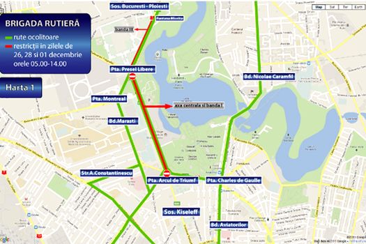 Între orele 5.00 – 14.00, traficul va fi restricţionat pe axul central al Şoselei Kiseleff şi banda I de circulaţie, pe tronsonul cuprins între Piaţa Presei Libere şi Piaţa Arcul de Triumf.