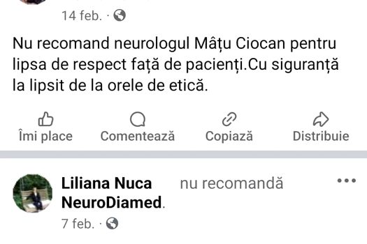 Un strigăt de disperare vine de la Liliana Nuca, stabilită în Lupeni (Hunedoara), şi priveşte clinica NeuroDiamed, de la Turnu-Severin: „Nu recomand neurologul Dina Manoiu. Mama mea a ajuns o legumă din cauza unui tratament prescris de ea. De 2 zile ne chinuim cu ea să o punem pe picioare”.