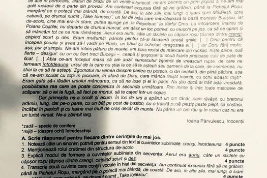 La primul subiect al examenului de evaluare naţională la limba şi literatura română, elevii au primit un text la prima vedere din „Inocenţii” de Ioana Pârvulescu, pe caza căruia au avut de răspuns la şase cerinţe.