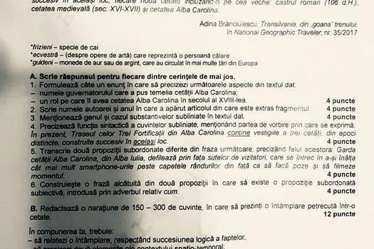 De asemenea, pentru rezolvarea subiectelor elevii au mai avut de redactat o naraţiune de 150-300 de cuvinte în care să prezinte o întâmplare petrecută într-o cetate.