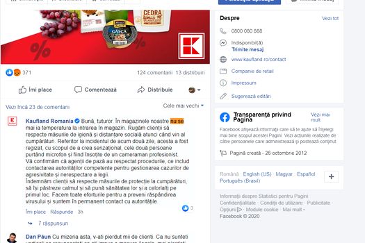 „Bună, tuturor. În magazinele noastre nu se mai ia temperatura la intrarea în magazin. Rugăm clienţii să respecte măsurile de igienă şi distanţare socială atunci când vin al cumpărături. Referitor la incidentul de acum două zile, acesta a fost regizat, cu scopul de a crea senzaţional, cele două persoane purtând microfon şi fiind însoţite de un cameraman profesionist.
