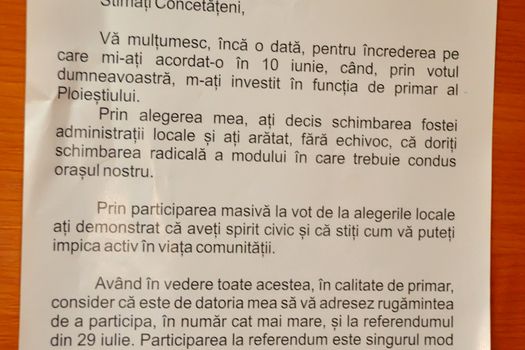 „Stimaţi concetăţeni, vă mulţumesc încă o dată pentru încrederea pe care mi-aţi acordat-o în 10 iunie, când prin votul dumneavoastră m-aţi investit în funcţia de primar al Ploieştiului. Prin alegerea mea aţi decis schimbarea fostei administraţii locale şi aţi arătat, fără echivoc, că doriţi schimbarea radicală a modului în care trebuie condus oraşul nostru. Prin participarea masivă la vot de la alegerile locale aţi demonstrat că aveţi spirit civic şi că ştiţi cum vă puteţi implica activ în viaţa comunităţii. Având în vedere toate acestea, în calitate de primar consider că este de datoria mea să vă adresez rugămintea de a participa, în număr cât mai mare şi la referendumul din 29 iulie. Participarea la referendum este singurul mod în care puteţi demonstra că voinţa dumneavoastră este suverană în această ţară. Veniţi la vot! Cu sinceritate, Iulian Bădescu, primarul municipiului Ploieşti„, este textul scrisorii primite de ploieşteni.