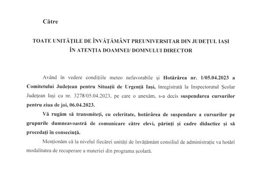 „Din cauza condiţiilor meteo nefavorabile care vor persista până în cursul zilei de mâine, 6 aprilie 2023, Comitetul Judeţean pentru Situaţii de Urgenţă (CJSU) Botoşani a luat decizia suspendării cursurilor în toate unităţile de învăţământ din judeţul Botoşani”, a scris pe Facebook inspectorul şcolar general din Botoşani, Bogdan Suruciuc.