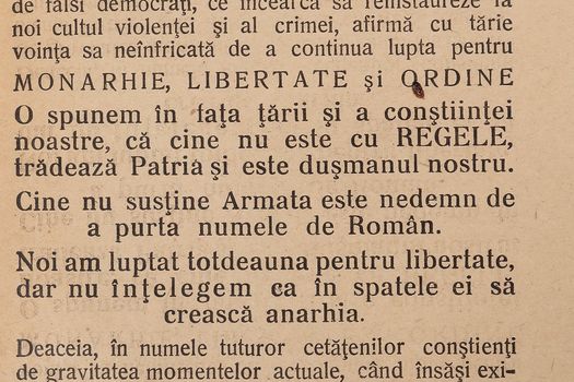 După lovitura de stat de la 23 august 1944 coordonată de rege, care l-a îndepărtat de la putere pe mareşalul Ion Antonescu, aliatul lui Hitler, ţara era ocupată de trupele sovietice care nu s-au retras după încheierea războiului şi au susţinut sovietizarea ţării prin şi de către Partidul Comunist Român. În această conjunctură, partidele democratice încercau să organizeze o opoziţie faţă de comunişti. O dovadă a acestui fapt este şi Manifestul Tineretului Naţional Liberal şi Naţional Ţărănesc din octombrie 1944, care chema la rezistenţă faţă de grupările paramilitare comuniste. Raritatea extremă are preţul de pornire de 100 de euro. Un alt exemplar de colecţie, din aceeaşi categorie, este manifestul comunist ilegal camuflat într-un program al cinematografului „Femina”. Piesa, cu preţul de pornire de 300 de euro, a fost tipărită de Partidul Comunist sub forma unui fluturaş de reclamă cinematografică pentru a masca manifestul de propagandă. Conţinutul se referă şi la dizolvarea de către Stalin a Internaţionalei a III-a Comuniste, cu sediul la Moscova.