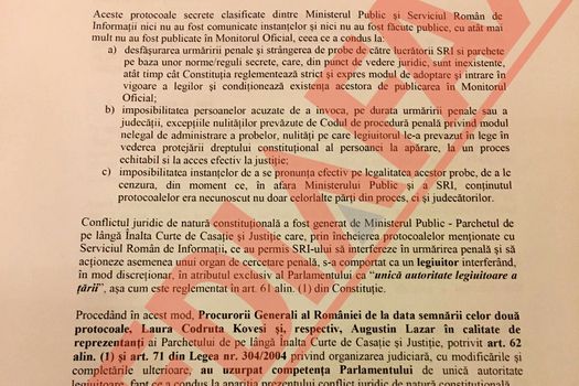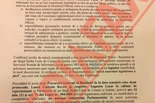 „Având în vedere că Ministerul Public- Parchetul de pe lângă Înalta Curte de Casaţie şi Justiţie, prin semnarea protocoalelor secrete cu Serviciul Român de Informaţii, şi-a încălcat propriile competenţe constituţionale, şi, uzurpând competenţele Parlamentului, a învestit Serviciul Român de Informaţii cu competenţa de a desfăşura activităţi specifice organelor de cercetare penală, fapt interzis expres de legiuitor prin legea 42/1992 privind organizarea şi funcţionarea SRI”, se arată în sesizarea Camerei Deputaţilor, la Curtea Constituţională.