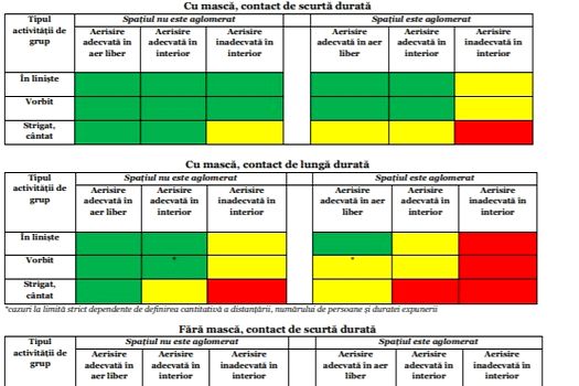 Astfel, dacă un asimptomatic are mască şi contactul e de scurtă durată, prezintă risc mediu de transmitere prin strigăt sau cântat într-un spaţiu neaglomerat în care aerisirea este inadecvată în interior.