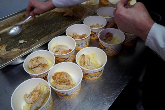 Rând pe rând, fix 1.214 recipiente cu mâncare proaspătă sunt umplute. Cele mai multe vor rămâne în Răşinari, iar aproape 100 sunt duse la şcoala din cătunul Prislop.