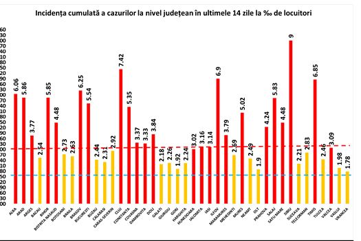 Rata de infectare 6 la mia de locuitori mai este depăşită de Alba (6,06), Braşov (6,25) şi Timiş (6,85).