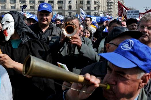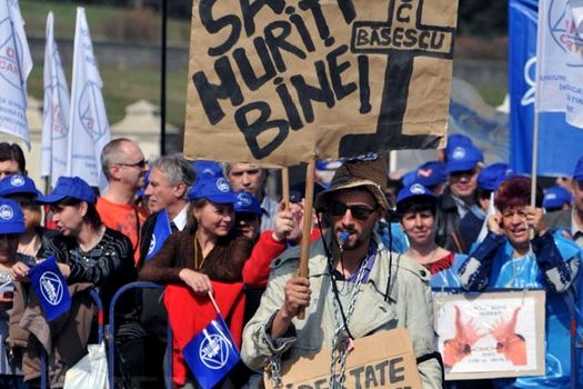 Sindicaliştii au bannere pe care scrie „Salvaţi Codul Muncii”, „Jos sclavia lui Băsescu! Ne întoarcem la Ceauşescu?”, „Băsescu, Boc, România / Codul muncii e sclavia; să vă scufundaţi bine!” şi scandează „Demisia”, „Jos Băsescu”, „Jos Guvernul Boc”, „Lăsaţi-ne”, „Jos, jos, jos guvernul mincinos”.