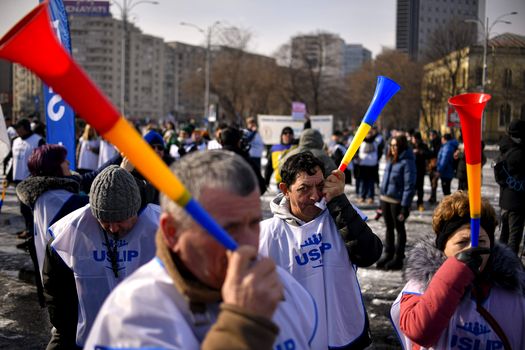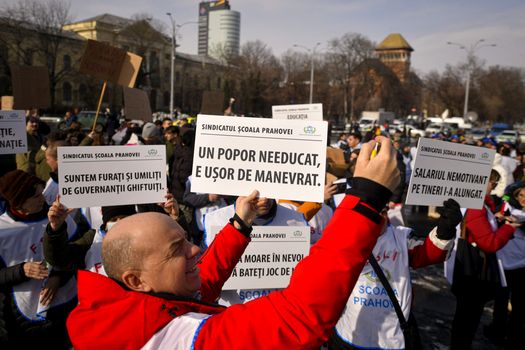 Sindicaliștii au început să se adune în Piața Victoriei pentru a protesta. Pe pancartele participanților la manifestație sunt scrise mesaje precum: „Școală săracă = țară needucată” și „Cereți performanță, dar oferiți ignoranță”.