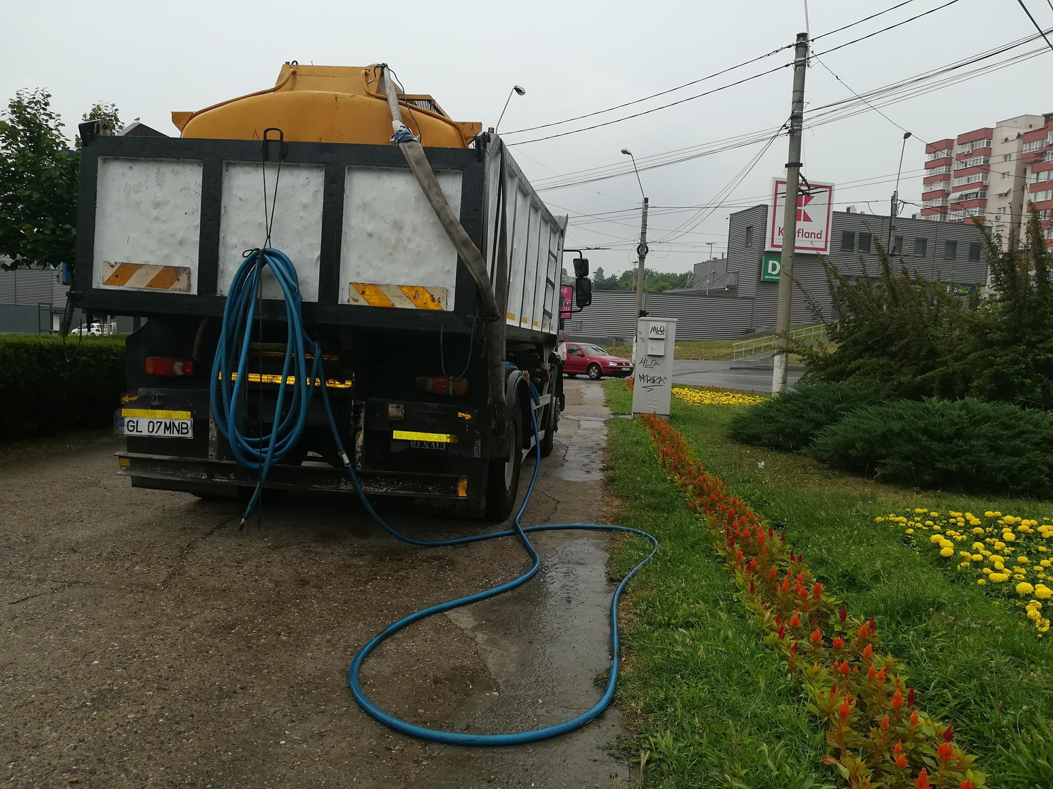 În ajutorul angajatei Primăriei Galaţi care uda florile şi gazonul deşi la Galaţi ploua de ore întregi a sărit şoferul autocisternei folosite la irigat: ”Uitaţi praf, este uscat pământul. Dar ne-am oprit din udat, colega mea a văzut că este filmată şi a spus că nu vrea să apară. Au mai fost probleme, tot aşa când s-a udat pe ploaie, şi de asta a plecat”.