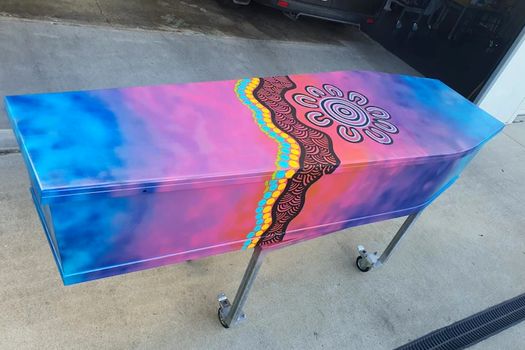 Allan McKenzie este un artist indigen din Australia şi lucrează şi câte cinci zile la un sicriu, pentru a-l picta „după sufletul” persoanei decedate.